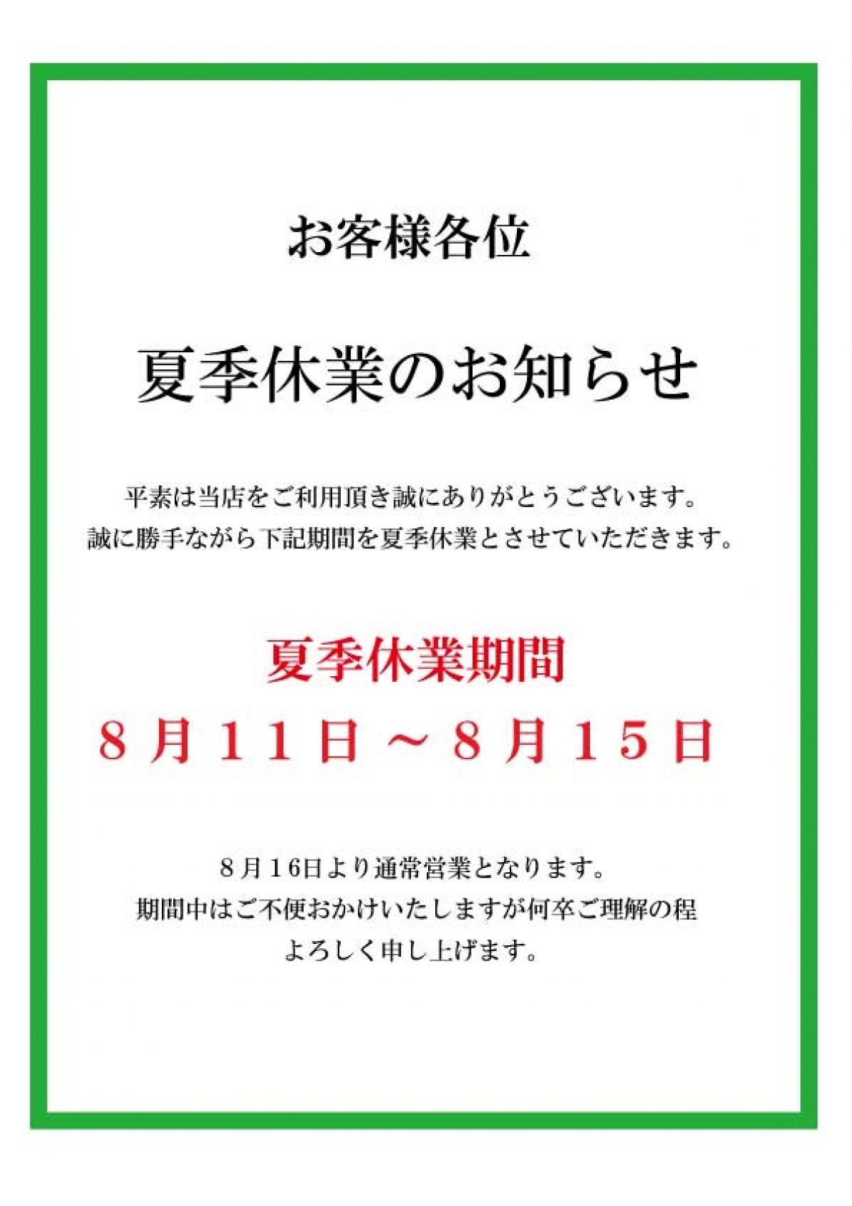 夏季休業のお知らせ